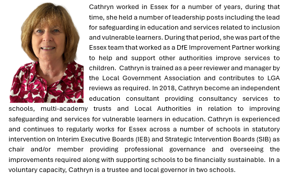 Heather is recently retired and has experience in supporting schools and governing bodies in both LA maintained schools and academies. She has a degree in business administration and has extensive experience managing teams and projects. She worked for Essex County Council (ECC) for over 14 years and had responsibility for overseeing aspects of school improvement, the Early Careers Teacher and Initial Teacher Training programmes, workforce development and performance data for schools. She has experience of supporting governors through coaching and mentoring, finance and health and safety. She also has experience linked to statutory intervention boards in schools causing concern, appointed by Essex County Council and the Department for Education. Prior to her career at ECC, she worked at an international school in Singapore where she was responsible for the management of transport logistics and operations serving over 2000 pupils.