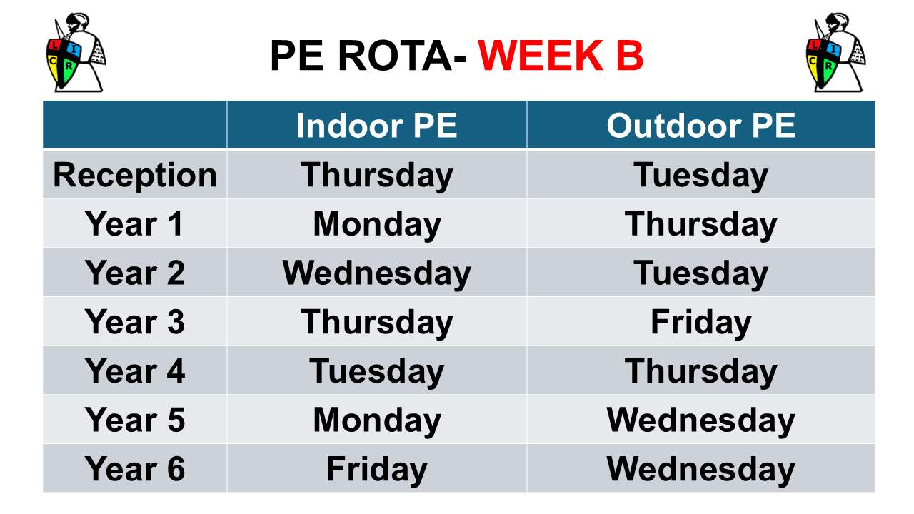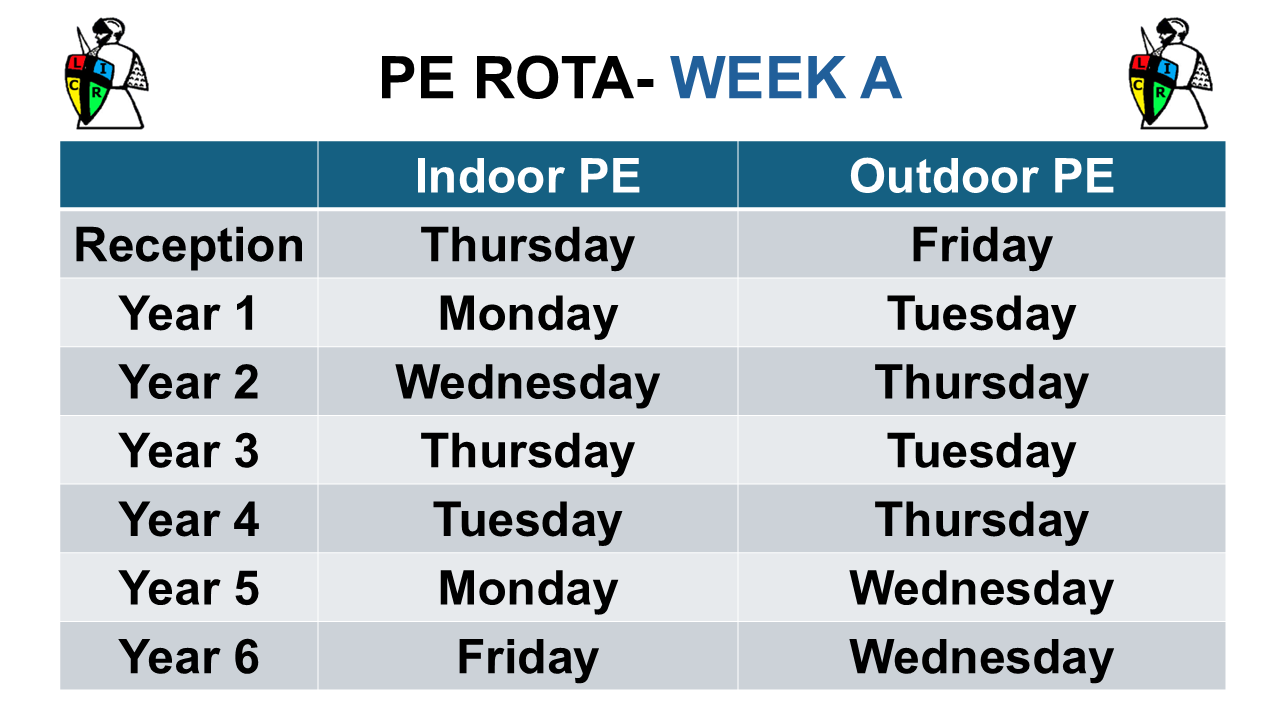 Years 1, 2, 3 and FS have outdoor PE on an A/B rotation.