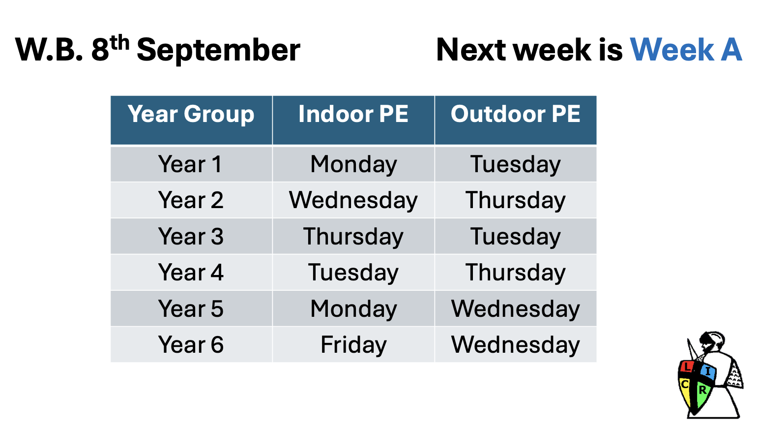 For children in Reception to Year 3, the outdoor PE lesson rotates each week. Teachers will remind children in class, and we will also include an updated PE schedule with our weekly newsletter. For example, please see next week’s schedule attached.
